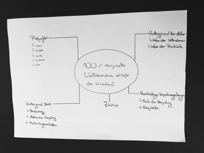 In der großen Blase in der Mitte steht die Hauptbotschaft. Die Kernaussage hat sich ergeben, als ich alle Informationen auf einen Blick hatte und mir vor Augen gehalten habe, für welche Zielgruppe ich schreibe (Branchenakteure, Verbände, Parteien) und für welches Format (Online-Magazin). So konnte ich die Fragen beantworten, was die Leser*innen an dem Thema interessieren wird (100 Prozent recycelte Weißblechdose) und welche Informationen für diese Form des Textes weggelassen werden können (Nachhaltiges Verpackungsdesign).
